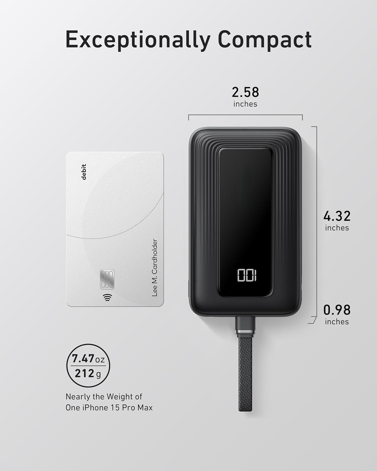 Durability on Demand: Features a 5.98-inch built-in USB-C cable that's not only convenient but also extremely durable, designed to withstand over 10,000 bends. This compact power bank measures 4.72 × 2.89 × 1.23" and weighs only 12.45 oz.